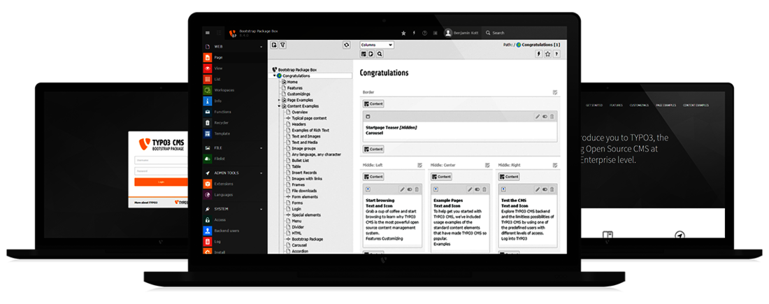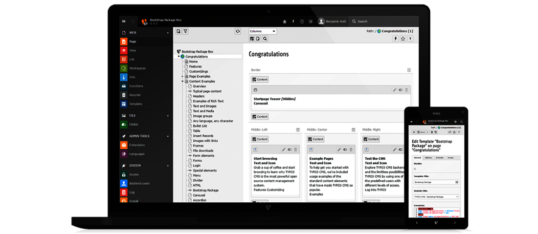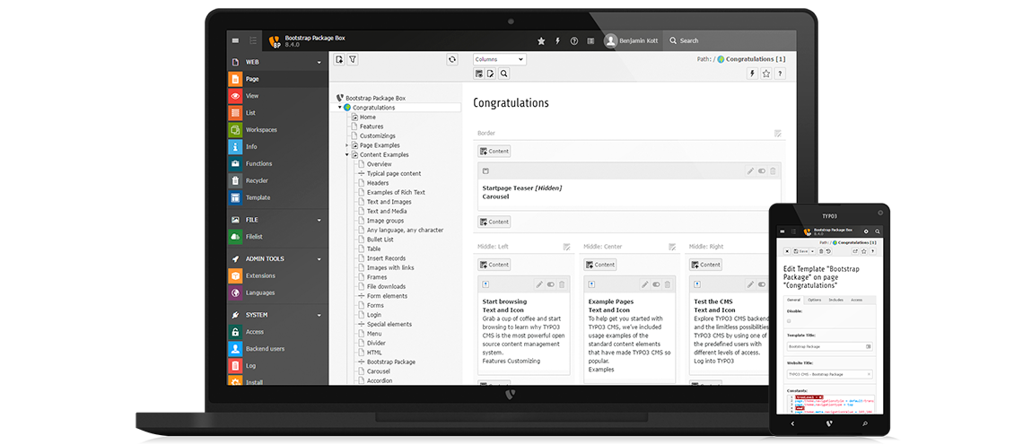 Die Administrationsoberfläche mit dem Namen TYPO3 Backend kann von jedem modernen Webbrowser, einschließlich Tablets und Smartphones, auf dieselbe Weise verwaltet werden. Das Veröffentlichen einer kleinen Änderung für unterwegs oder das Arbeiten mit Tablet-Geräten zum Hinzufügen von Inhalten war noch nie einfacher.